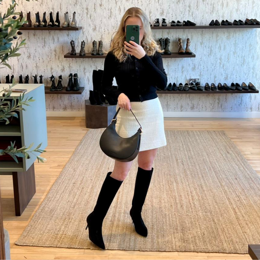 The Alassio boot combines timeless elegance with a modern silhouette. Crafted from luxurious black suede, it features a pointed toe that lends a touch of sophistication. With a sleek stiletto heel and a streamlined design, the Alassio boot is perfect for elevating both day and evening looks.