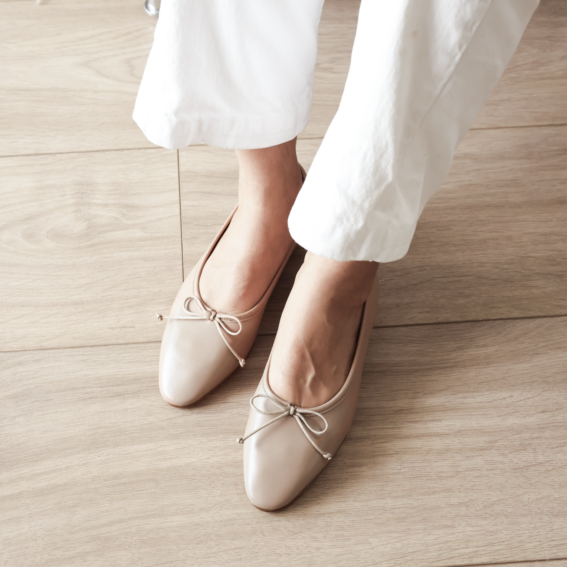 The Como, our classic ballerina flat, has a longer toe box and a slim shape that elongate the legs to perfection. The low stacked heel is comfortable for everyday wear, and a cotton bow adds a pretty, feminine touch.