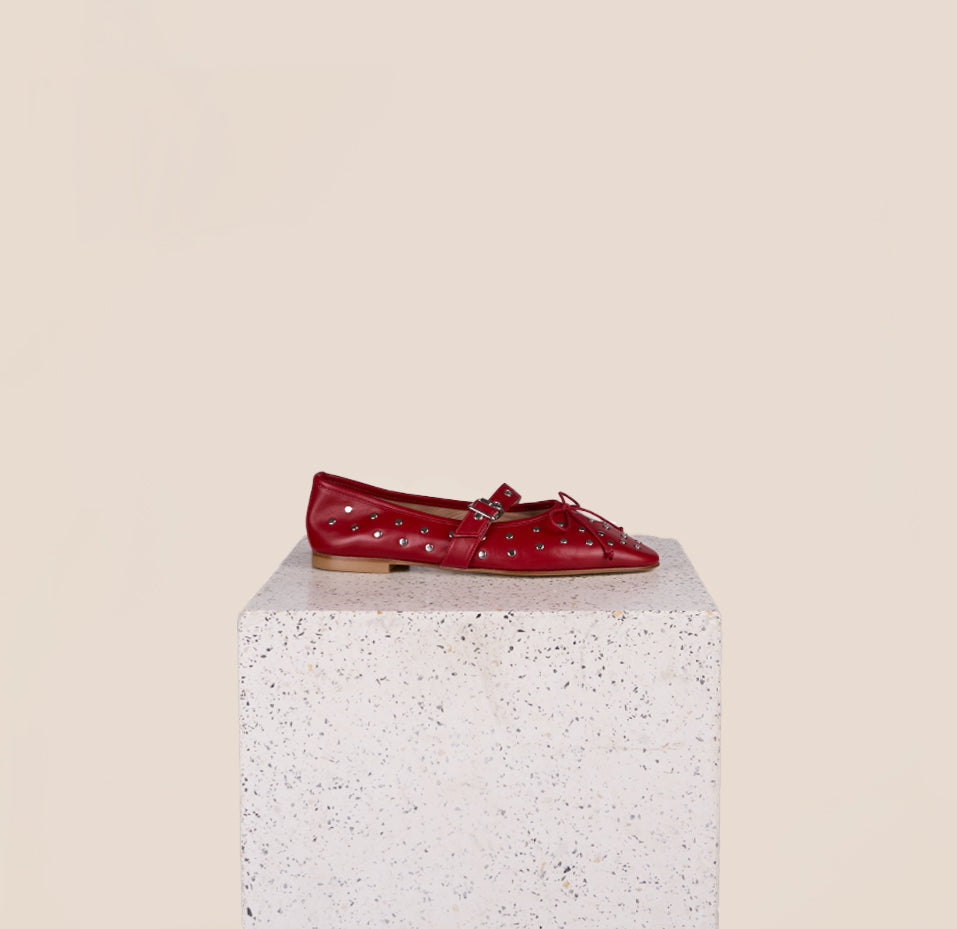 Como, our classic ballerina flat, is designed with a longer toe box and a sleek, leg-lengthening silhouette. This version features an elegant Mary Jane-style strap with an adjustable buckle, adding a refined yet modern touch. Silver-toned stud detailing enhances its bold yet feminine look, while the low-stacked heel ensures comfort for all-day wear.