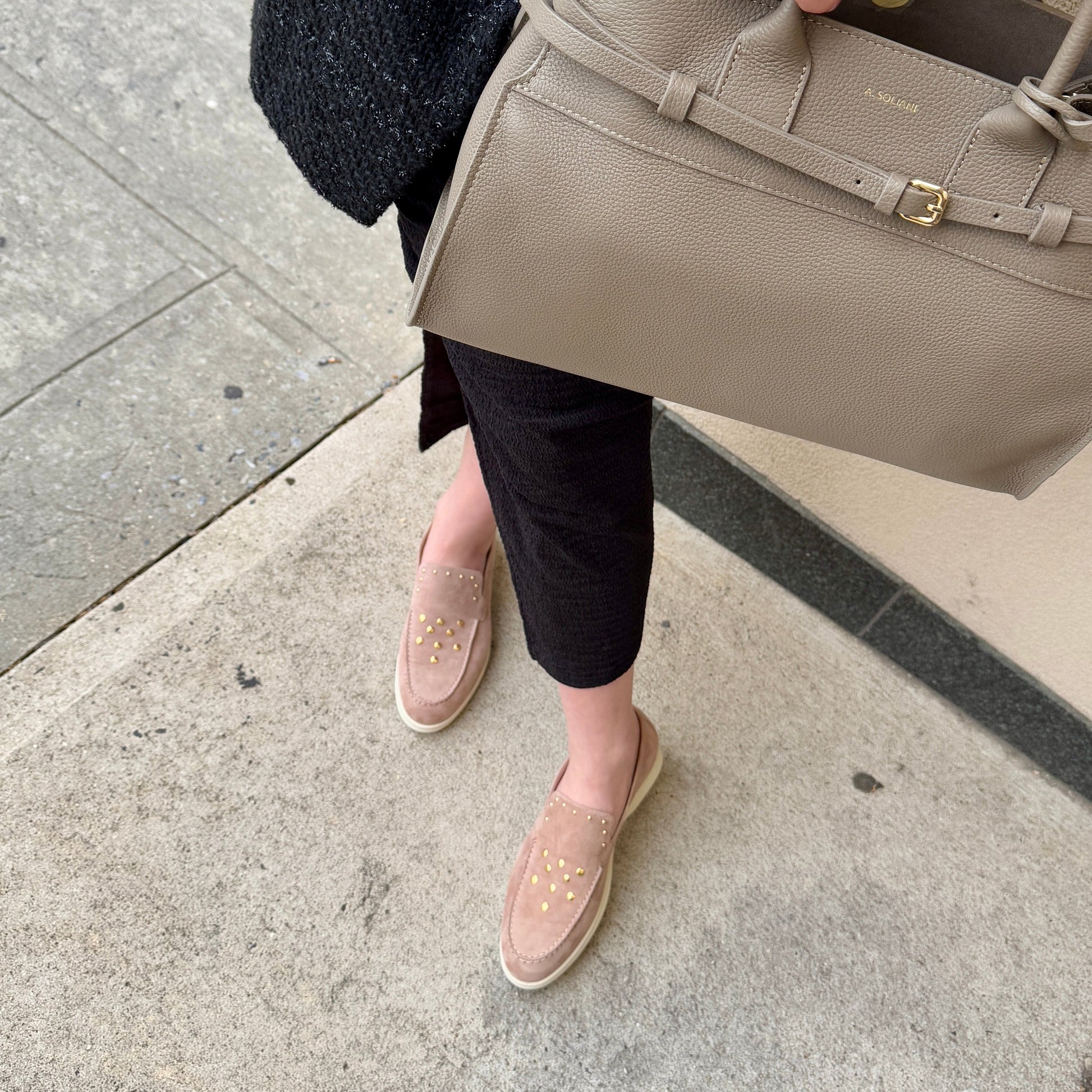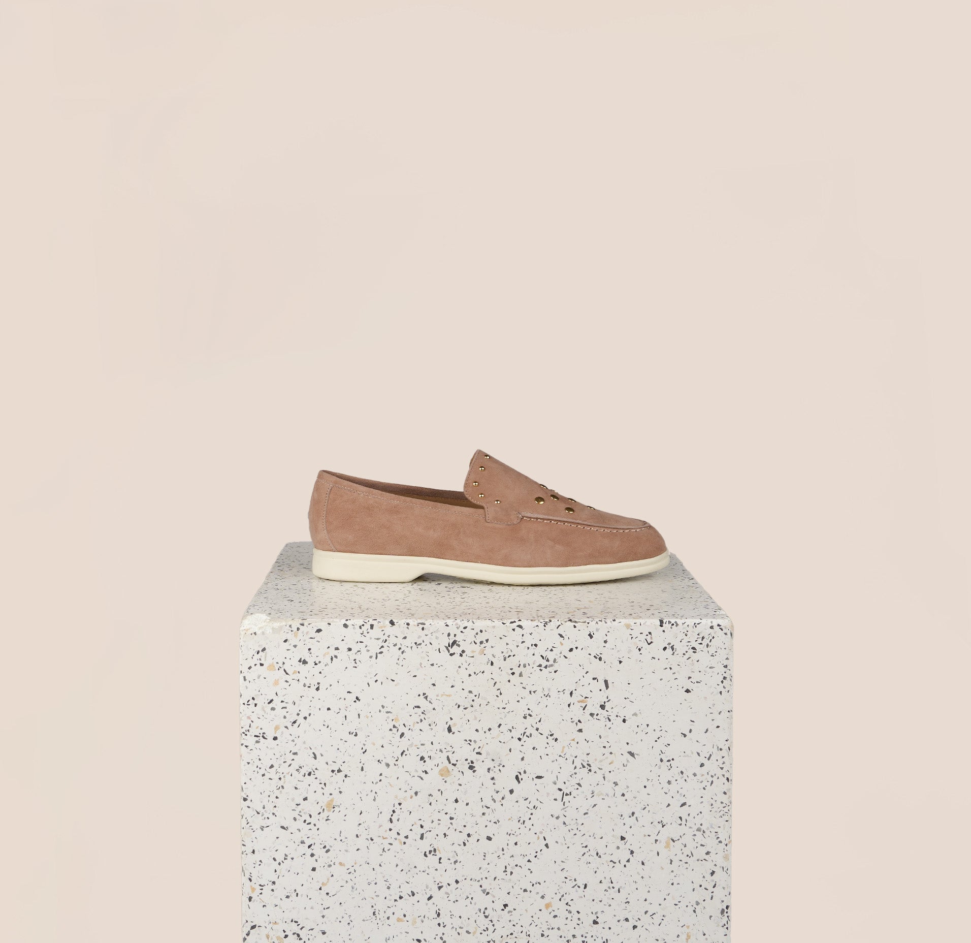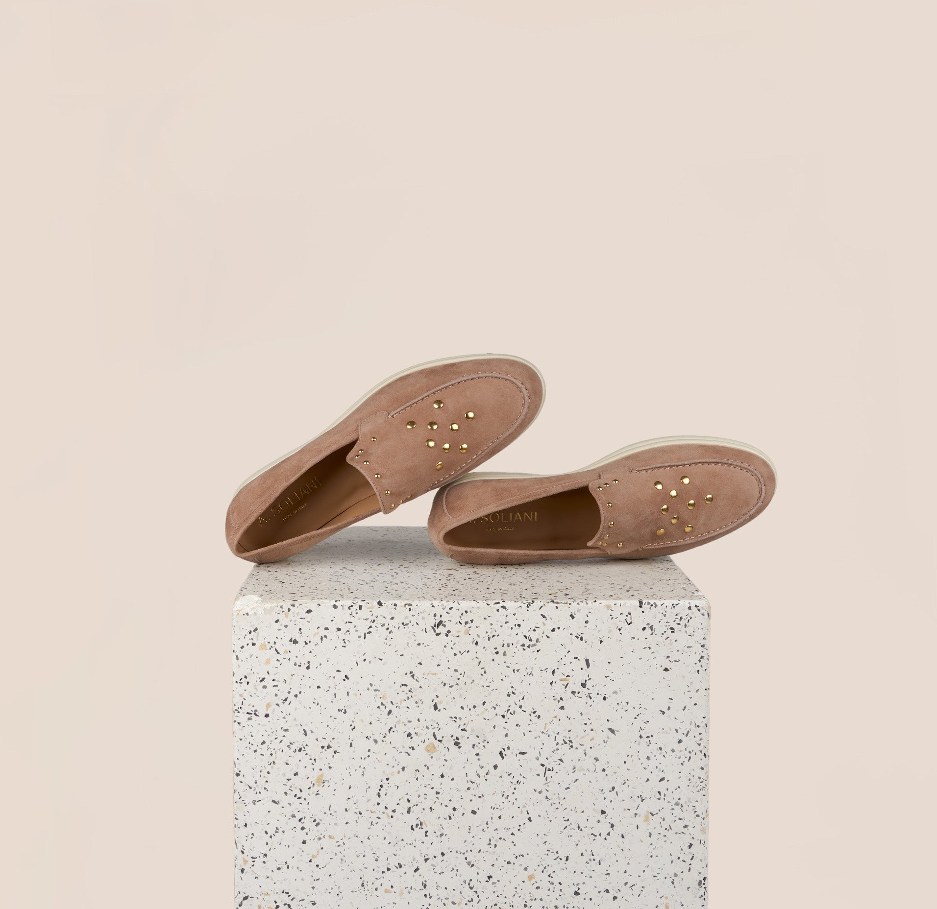 Expert craftsmen in Italy have carefully crafted the 'Lisa' loafer to be a lightweight and comfortable shoe with a casual-chic design that is ideal for all year round. The shoe boasts a high-quality and flexible rubber sole, an enveloping upper for added comfort, and an understated elegance that sets it apart. Additionally, the shoe is made with olive suede leather, features hand-stitched details on the sides of the vamp, and has a reinforced heel.
