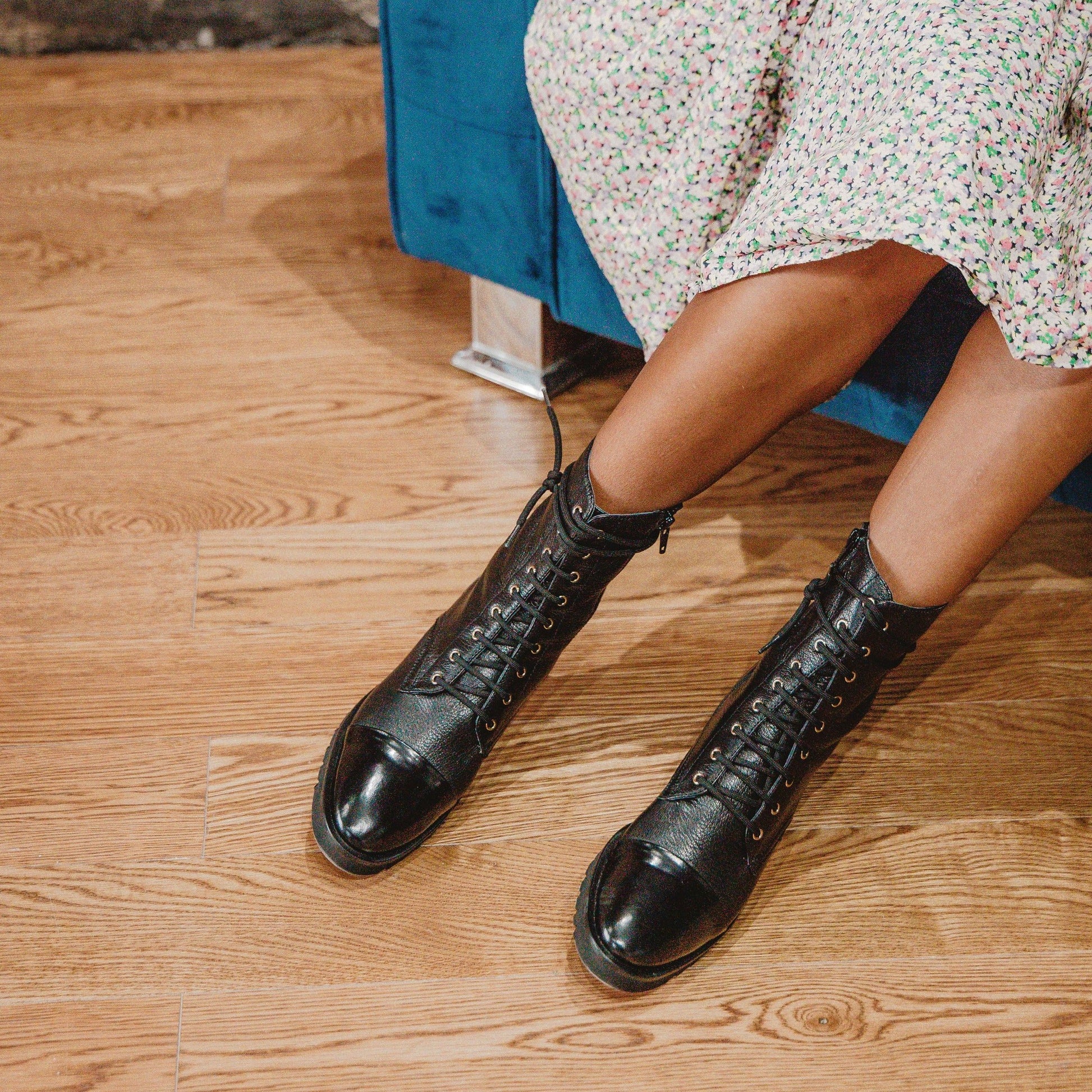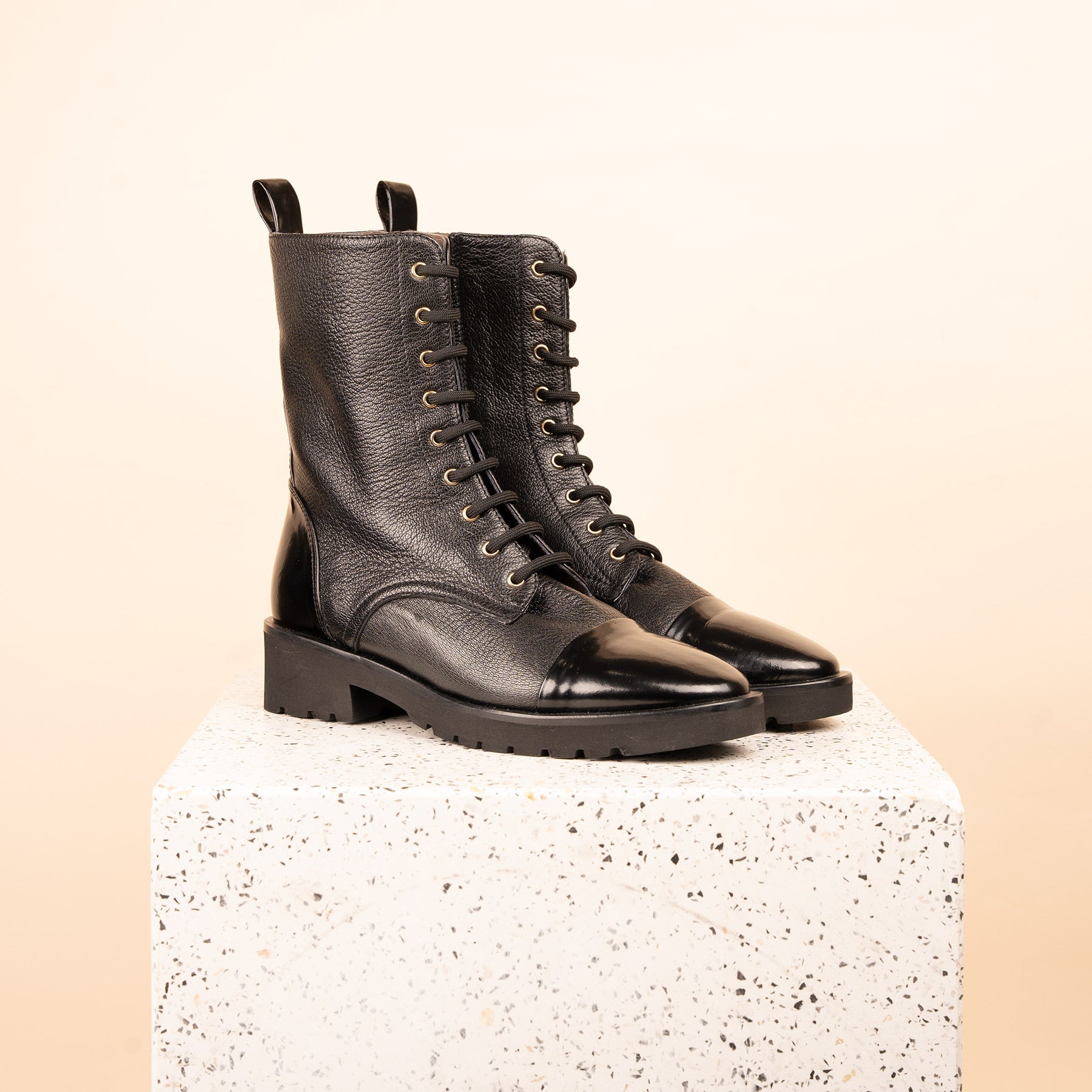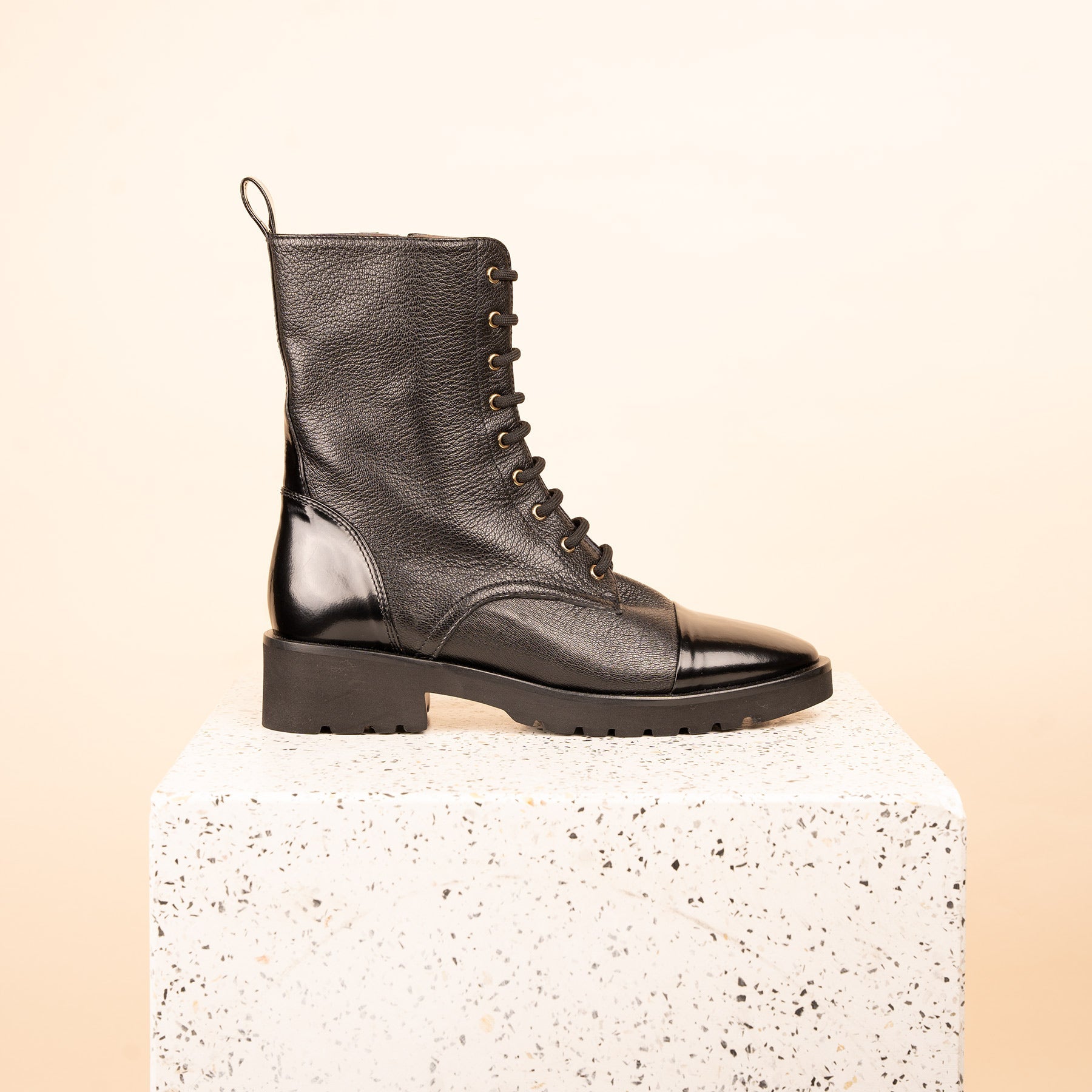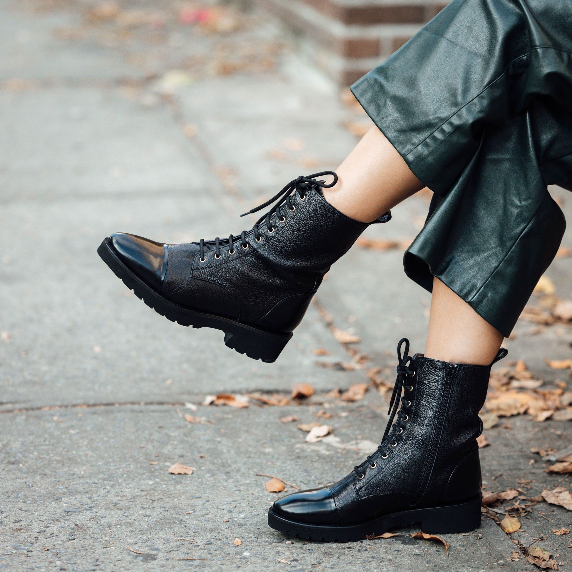 Our updated version of the combat boot features patent leather accents at the heel and toe and has an extra-light lug sole that will make you feel like you're walking on air. Cotton laces allow for adjust-ability, while a size zipper makes slipping them on a breeze. With its refined almond toe and close fit around the leg, the Lucca will add sporty sophistication to your looks at work, on outings with friends, or on date night.
