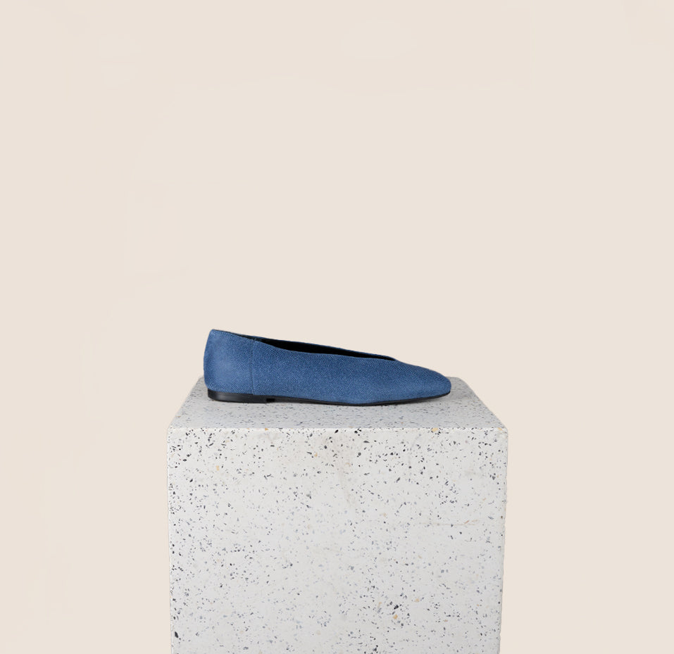 The Scala flats are available in a unique printed suede that resembles denim. This innovative material combines the softness and flexibility of suede with a stylish denim-like pattern, offering a modern and casual twist to classic suede.